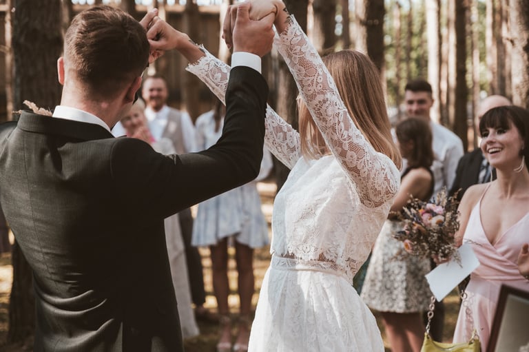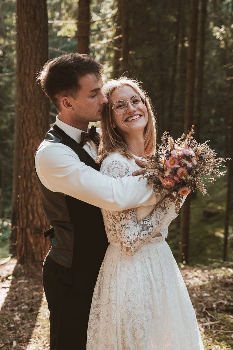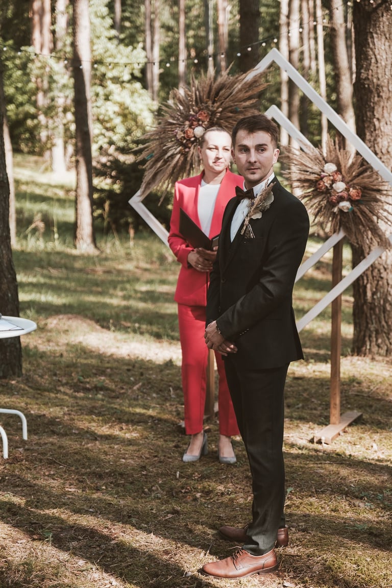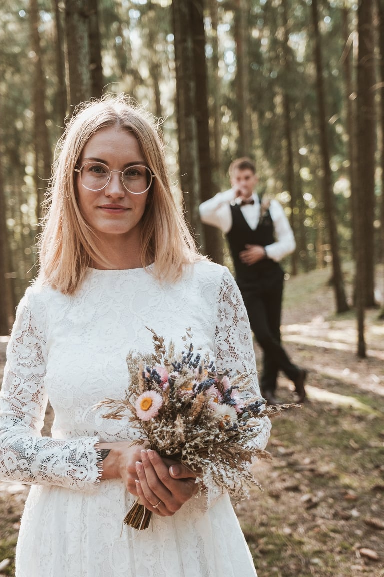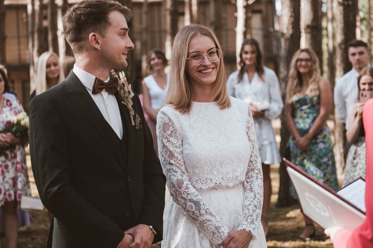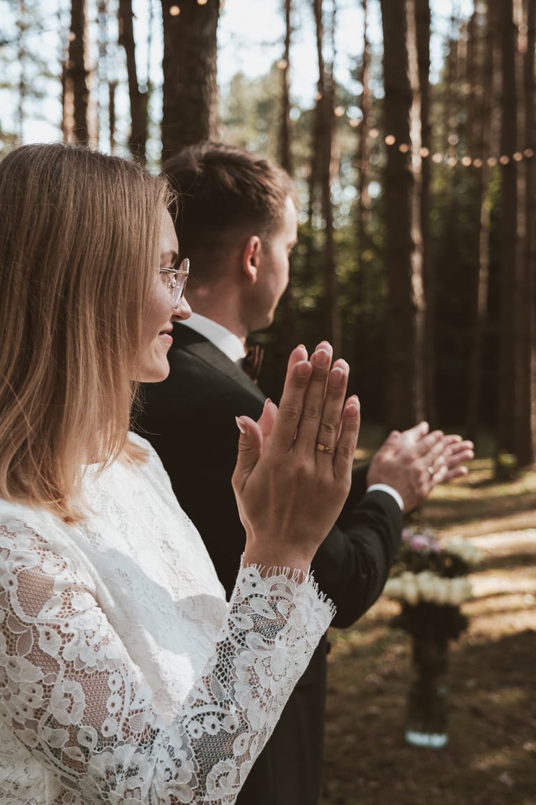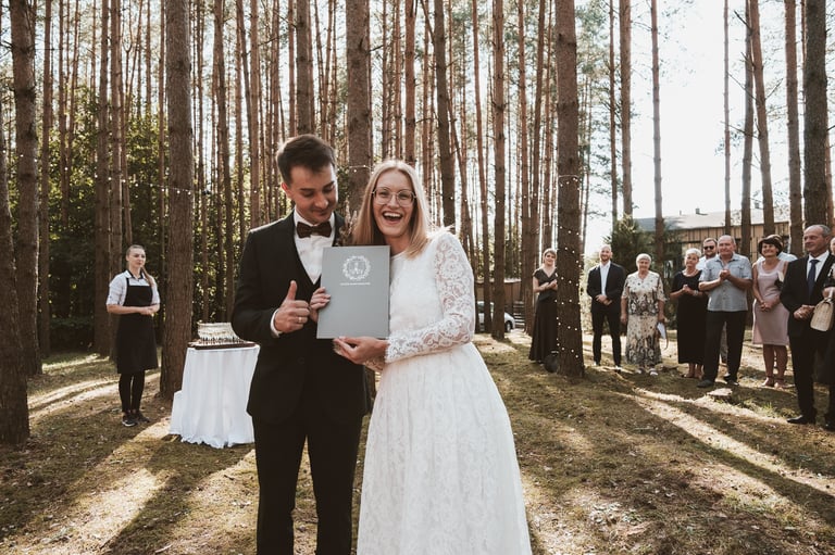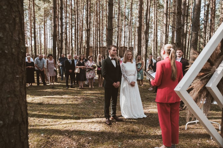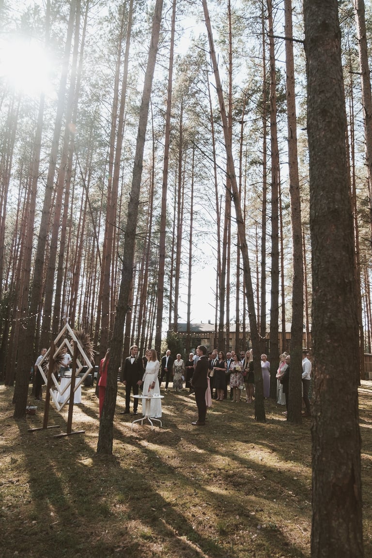 Susitikome per pietus, jaunieji ramiai ruošėsi ceremonijai, rinkosi svečiai. Įamžinę trumpą pasiruošimą, keliavome į ceremoniją, kuri vyko čia pat - miške ir buvo tikrai labai jauki. Po jos nuvykome į kelias vietas gamtoje, kurias jaunieji jau buvo nusižiūrėję iš anksto, pasidarėme fotosesiją ir grįžome švęsti.